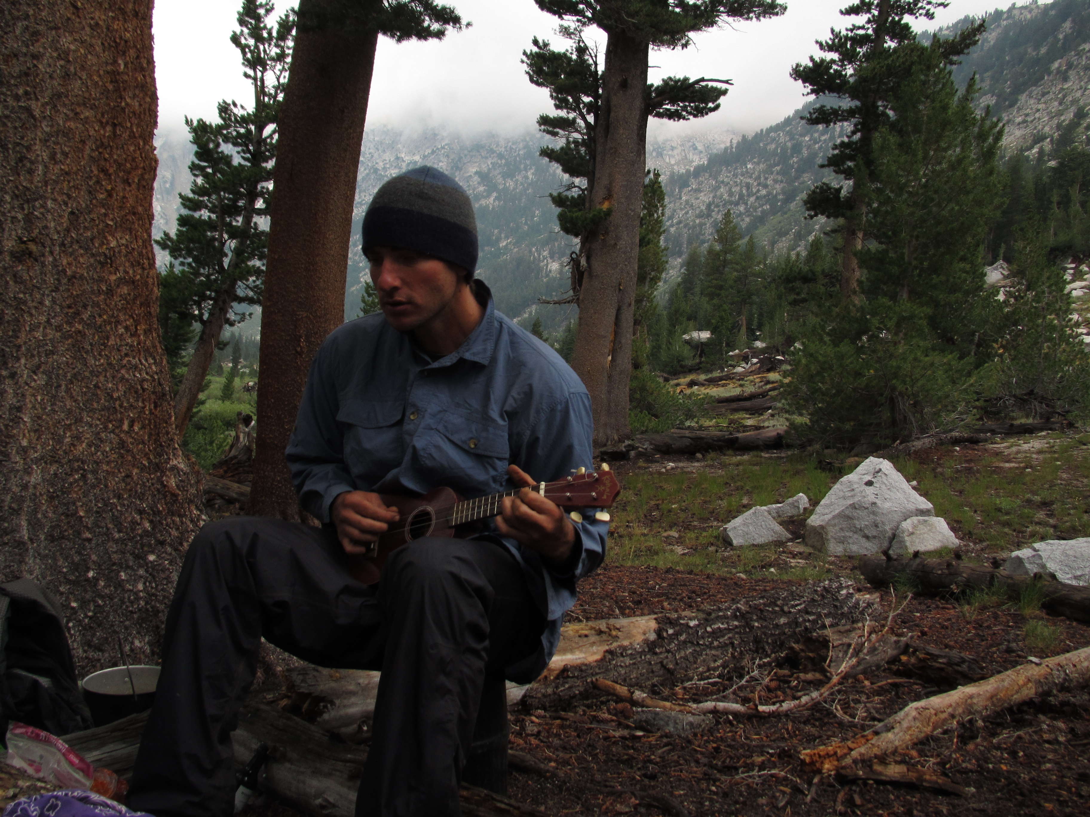 It was a beautiful lake beneath the mountains leading up toward Matterhorn Peak (named for it’s resemblance to the Matterhorn in Switzerland). We spent our first night praying for good weather when it was drizzling on our tent. We knew we had much higher to go and would prefer some gentle weather – either way we were going. Rain or shine. I do a lot of praying, especially when I am in the wilderness. I pray for safety, warmth, comfort, and a smooth trip. Not to anyone in particular, to God, to nature, to the universe – whatever may be hearing my request and my ever gratefulness for all the blessings I have received thus far in my journey through life. Our second day it rained on and off all day. We hiked through the mist into the majestic Matterhorn Canyon and almost as an answer to my prayers the rain stopped and we saw a few stars in the sky. That night we had a fire, Ted played his ukulele, and we cooked a fantastic feast.