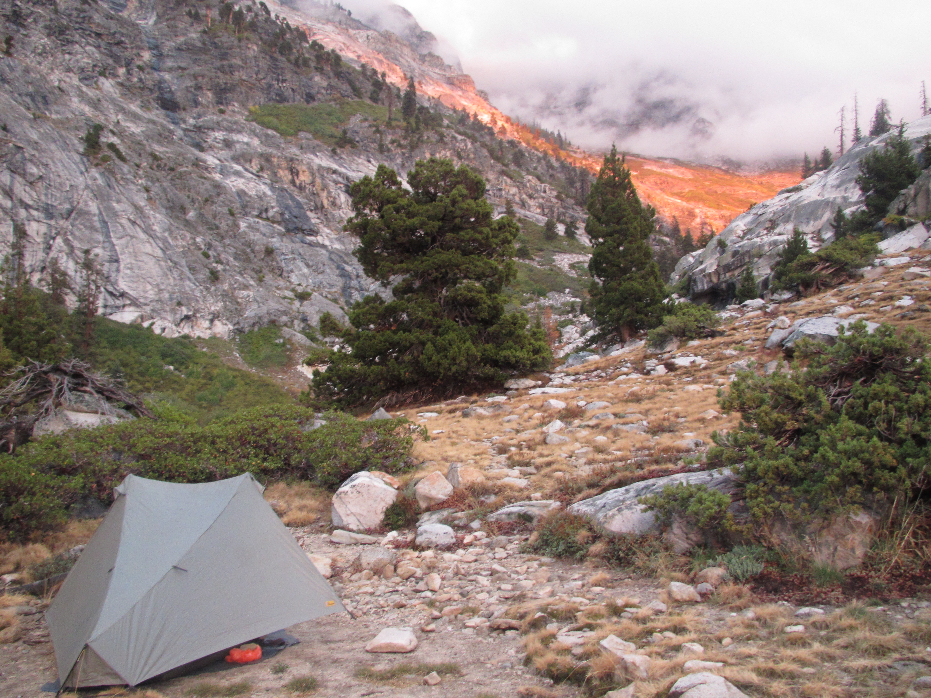 That night we fell asleep with the rain door open. But when we woke up in the morning we realized that at some point the door had been shut and it had rained all night on us. Neither of us remember waking up and shutting it, not to mention it is a tight door that really takes some force to open and close. It was a mystery. Had we been protected by some guardian way out there in the middle of the mountains? We will never know. I did some research once our trip was over, and I learned of a man named Fred Claassen who went missing while on the same hike we were on. His body was found 7 years after his disappearance at the base of Whorl Mountain, very near to where we were camped that night. He had fallen to his death from a ledge during a deadly storm. Part of me would like to think it was Fred who heard my prayers and shielded us from the rain that night. All I asked for was to be warm and dry, and I was. Thanks to Fred!