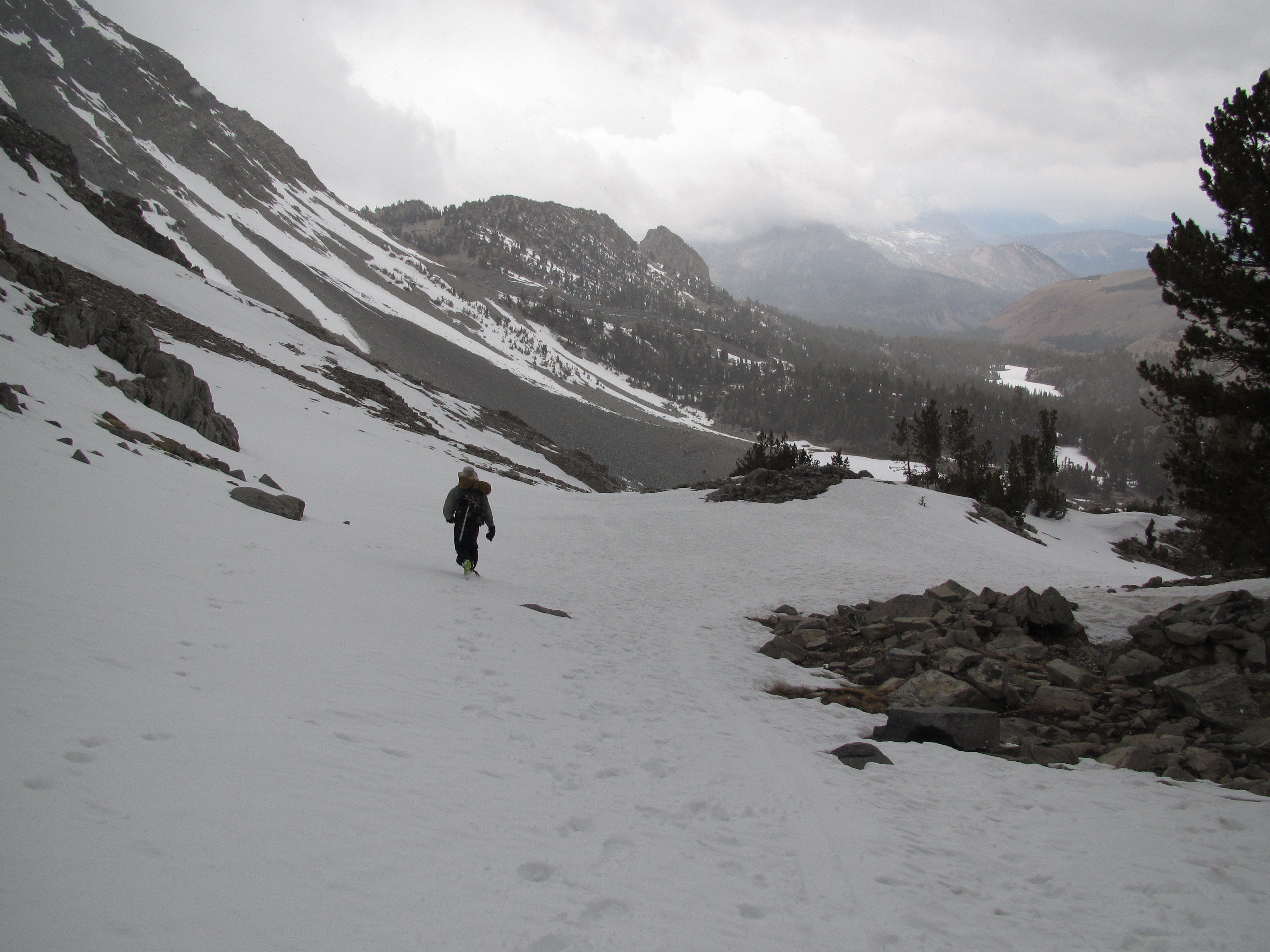 When I was a kid, my Dad took my brother and I backpacking for the first time. Our destination was Barney Lake, just a few miles from Mono Village in the Eastern Sierra. We never made it because my brother hurt his knee on a stream crossing. I recall the most uncomfortable night I’ve ever experienced in the wilderness. I woke up repeatedly scrunched up at the bottom of the tent because we were camped on a slope. Since we had to stop when the injury happened, it wasn’t an ideal location. To make matters worse, I was awoken by the sound of a bear roaring outside of the tent. My dad was awake already and trying to scare it off. At the time, I thought it was hilarious, and started cracking up inside the little tent with my brother. The bear had a cub and was trying to get our food hung high in a tree. They eventually ran off. I didn’t make it to Barney Lake on that trip, but now – at 27 years old I was setting off to hike Matterhorn Canyon with Ted from Mono Village to Tuolumne Meadows. In between those two places lay the ever illusive Barney Lake, and after only 5 or so miles, I was standing at the place I was supposed to see when I was 9 years old – 18 years later.